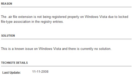 If you ever have problems installing Adobe AIR applications on Windows Vista because the .air extention is not recognised, do a "open with" and find the executable located in "Program Files/Common Files/Adobe AIR/Versions/1.0/"