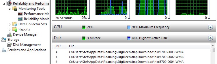 We weten nu in welke map DigiLeen de bestanden zet en dat blijken WMA bestanden te zijn. Windows Media Audio, die van een "Digital Rights Media" media zijn voorzien zodat ze maximaal 7 dagen op 1 PC kunnen worden afgespeeld. (En ze worden trouwens ook niet gewist, maar gewoononbruikbaar waardoor je een jaartje lenen met honderden megabytes aan nutteloze bestanden zit)