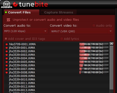 TuneBite zet de beveiligde WMA bestanden om naar DRM-loze mp3 bestanden door deze af te spelen en terug op te nemen. Dat klinkt onhandig en tijdrovend maar Tunebite doet dat netjes intern met 9 bestanden tegelijk, dus dat gaat goed voouit. 22 tracks omzetten duurde zo'n 10 minuten.