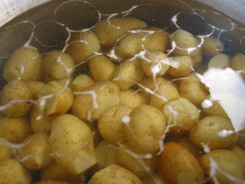 Men verwijdere de -blauwe plekken- van 25 kilo patatten en legge de patatten ongeschild in koud water in een grote pot.